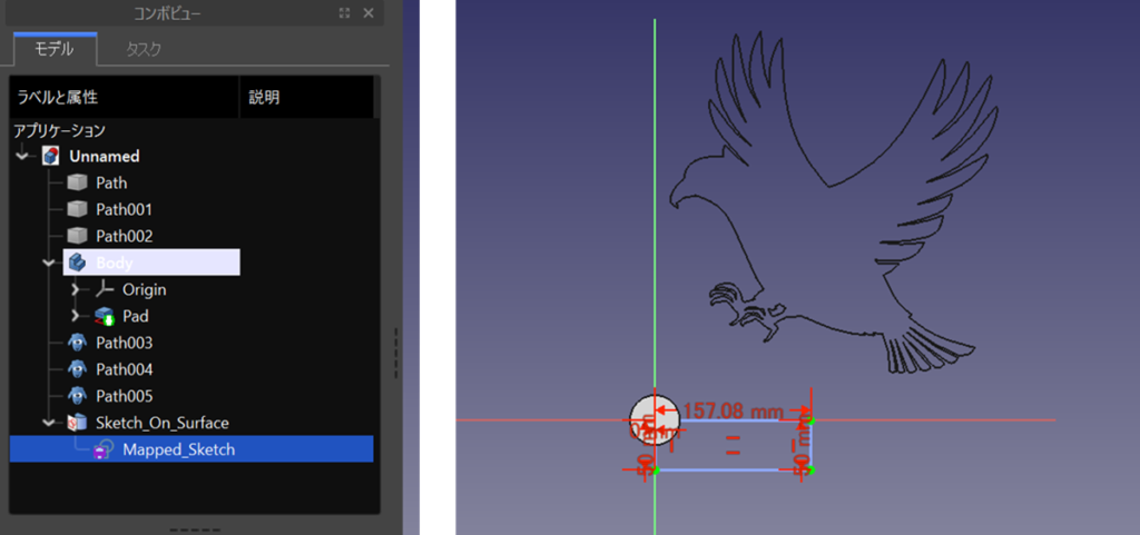 投影の位置をズラしたい場合は、「Mapped_Sketch」をダブルクリックすると、長方形の寸法線が現われますので、そこで文字の位置を調整してください。