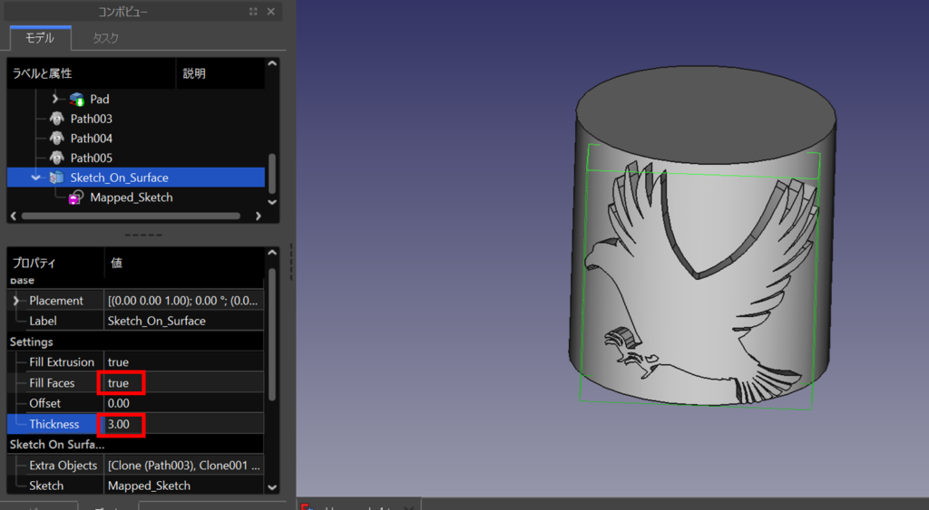 「Sketch_On_Surface」をクリックして、パラメータ内のFill Facesを「false→true」、Thicknessを「正の値」に変更すると、下図のように立体的にすることができます。